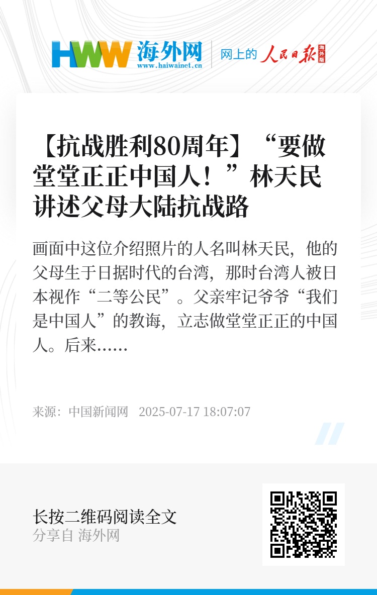 画面中这位介绍照片的人名叫林天民,他的父母生于日据时代的台湾,那时台湾人被日本视作“二等公民”。父亲牢记爷爷“我们是中国人”的教诲,立志做堂堂正正的中国人。后来,父亲考上日本庆应义塾大学医学部,在日期间秘密接受共产主义思想,决心去大陆寻求参加抗战的机会。