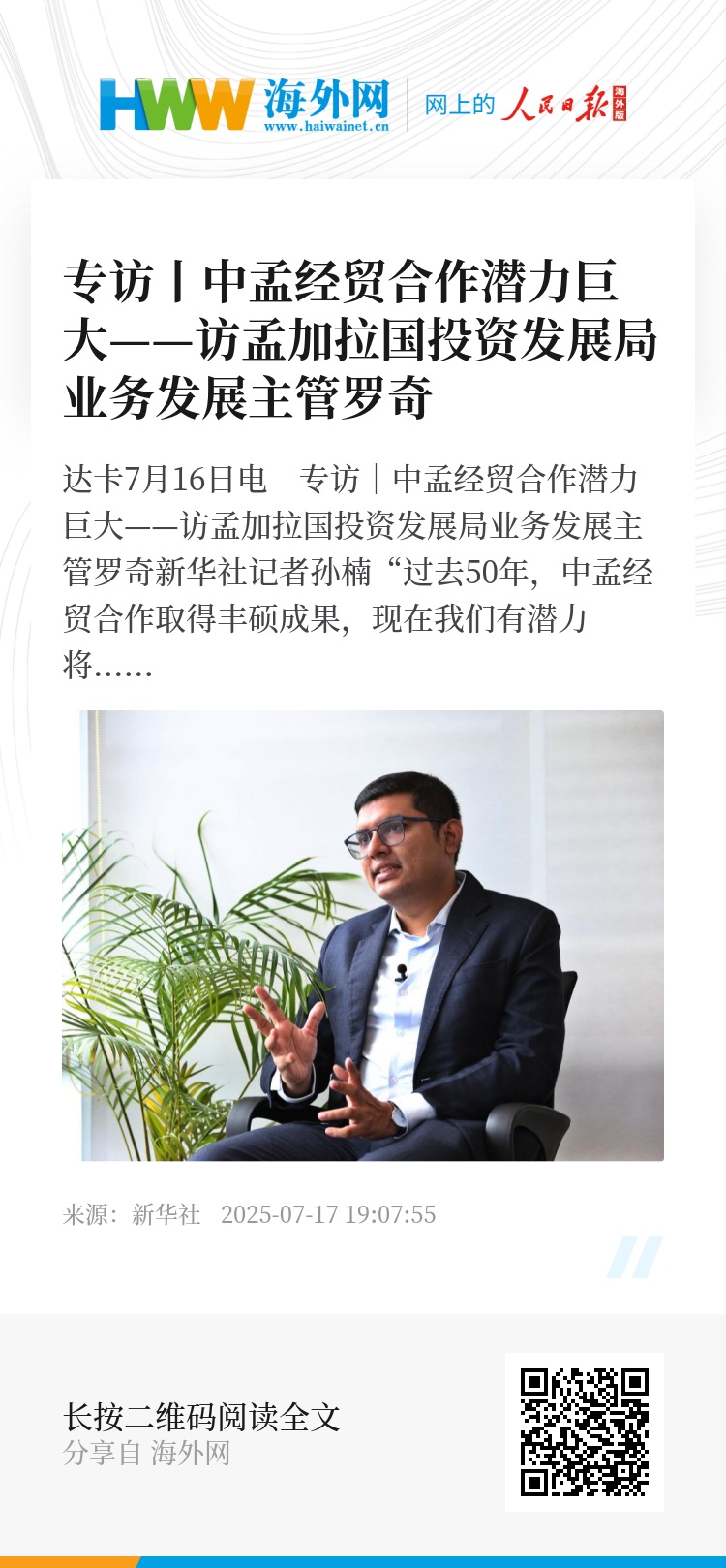 新华社达卡7月16日电 专访|中孟经贸合作潜力巨大——访孟加拉国投资发展局业务发展主管罗奇