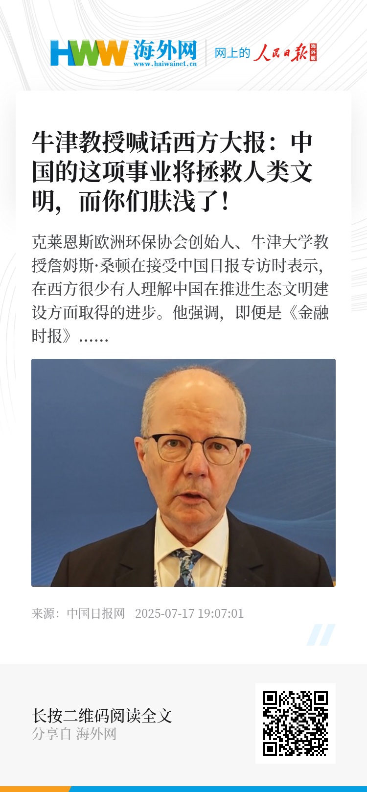 克莱恩斯欧洲环保协会创始人、牛津大学教授詹姆斯·桑顿在接受中国日报专访时表示,在西方很少有人理解中国在推进生态文明建设方面取得的进步。他强调,即便是《金融时报》《经济学人》中最资深的评论员也未能理解中国在生态文明建设中秉持的整体协同观,而中国的生态文明理念或许能拯救人类文明,是气候变化时代人类生存繁荣的最大希望。(记者 侯黎强 实习生 张译丹)