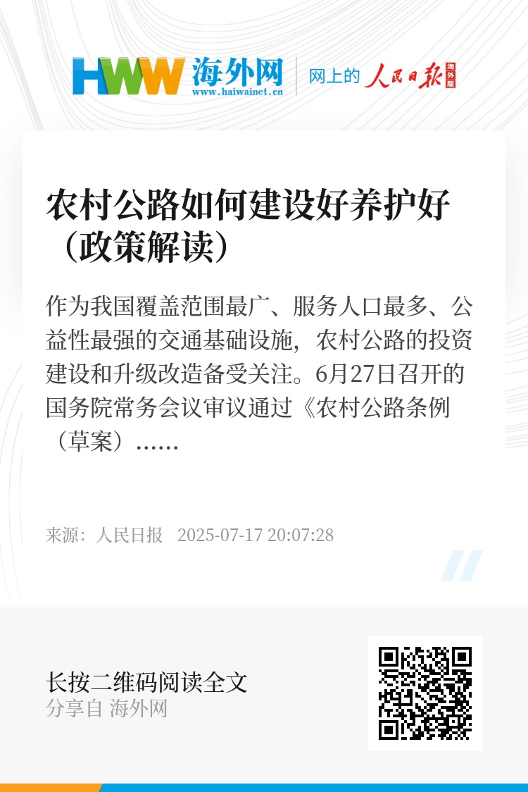 6月27日召开的国务院常务会议审议通过《农村公路条例(草案)》(以下简称《条例》),将“四好农村路”经验、做法、要求以法规形式固化下来,从更高层面、更全维度规范农村公路建设、管理、养护、运营等工作。