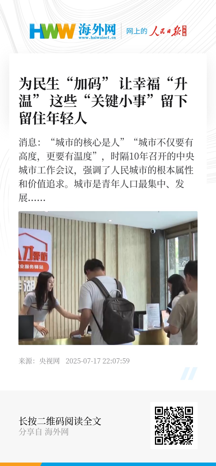 央视网消息:“城市的核心是人”“城市不仅要有高度,更要有温度”,时隔10年召开的中央城市工作会议,强调了人民城市的根本属性和价值追求。城市是青年人口最集中、发展最活跃的区域,找到一份工作是许多年轻人选择一个城市的第一步。为了吸引青年人才,多地出台一系列举措,湖南长沙就提出让“长沙不只适合打卡、更适合打拼”。