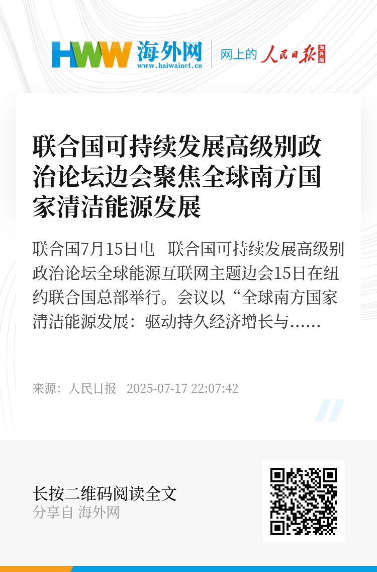 新华社联合国7月15日电 联合国可持续发展高级别政治论坛全球能源互联网主题边会15日在纽约联合国总部举行。会议以“全球南方国家清洁能源发展:驱动持久经济增长与构建伙伴关系”为主题,聚焦全球南方国家清洁能源发展,旨在加快推动全球能源转型,促进全球南方国家可持续发展。