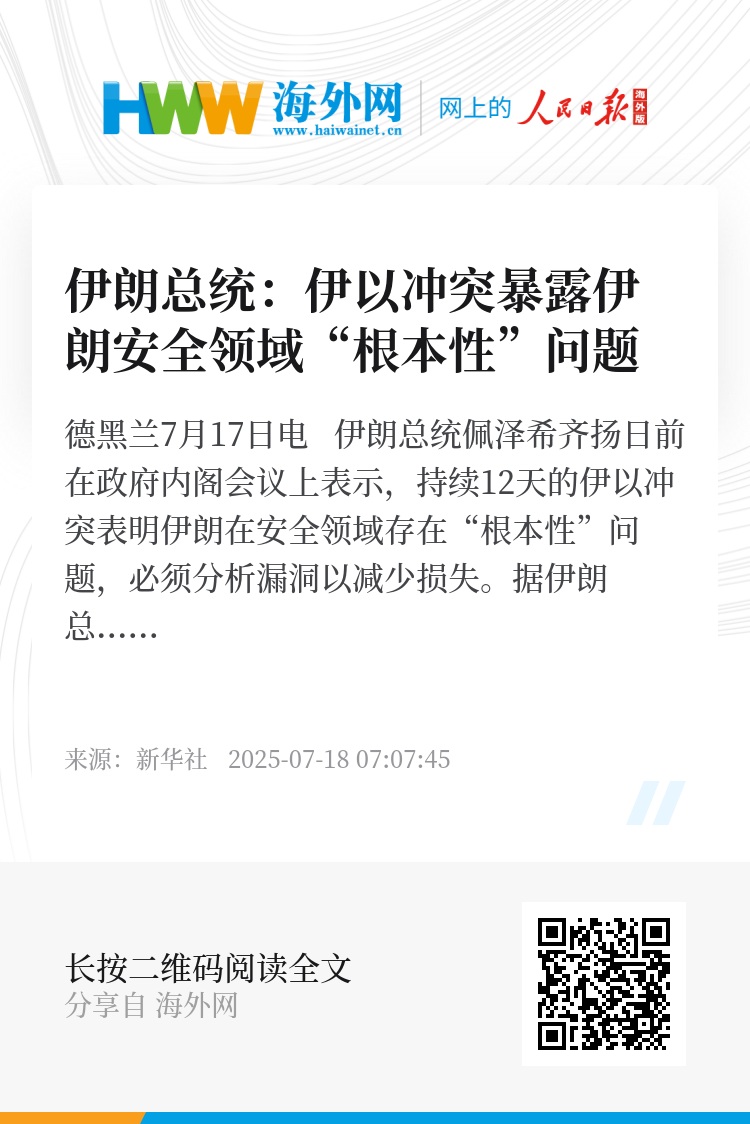 新华社德黑兰7月17日电 伊朗总统佩泽希齐扬日前在政府内阁会议上表示,持续12天的伊以冲突表明伊朗在安全领域存在“根本性”问题,必须分析漏洞以减少损失。