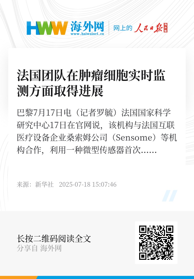 新华社巴黎7月17日电(记者罗毓)法国国家科学研究中心17日在官网说,该机构与法国互联医疗设备企业桑索姆公司(Sensome)等机构合作,利用一种微型传感器首次实现对肿瘤细胞时空动态(即随时间推移的细胞变化)的非侵入性实时监测,此项突破可能为癌症的诊断与治疗带来新视角。