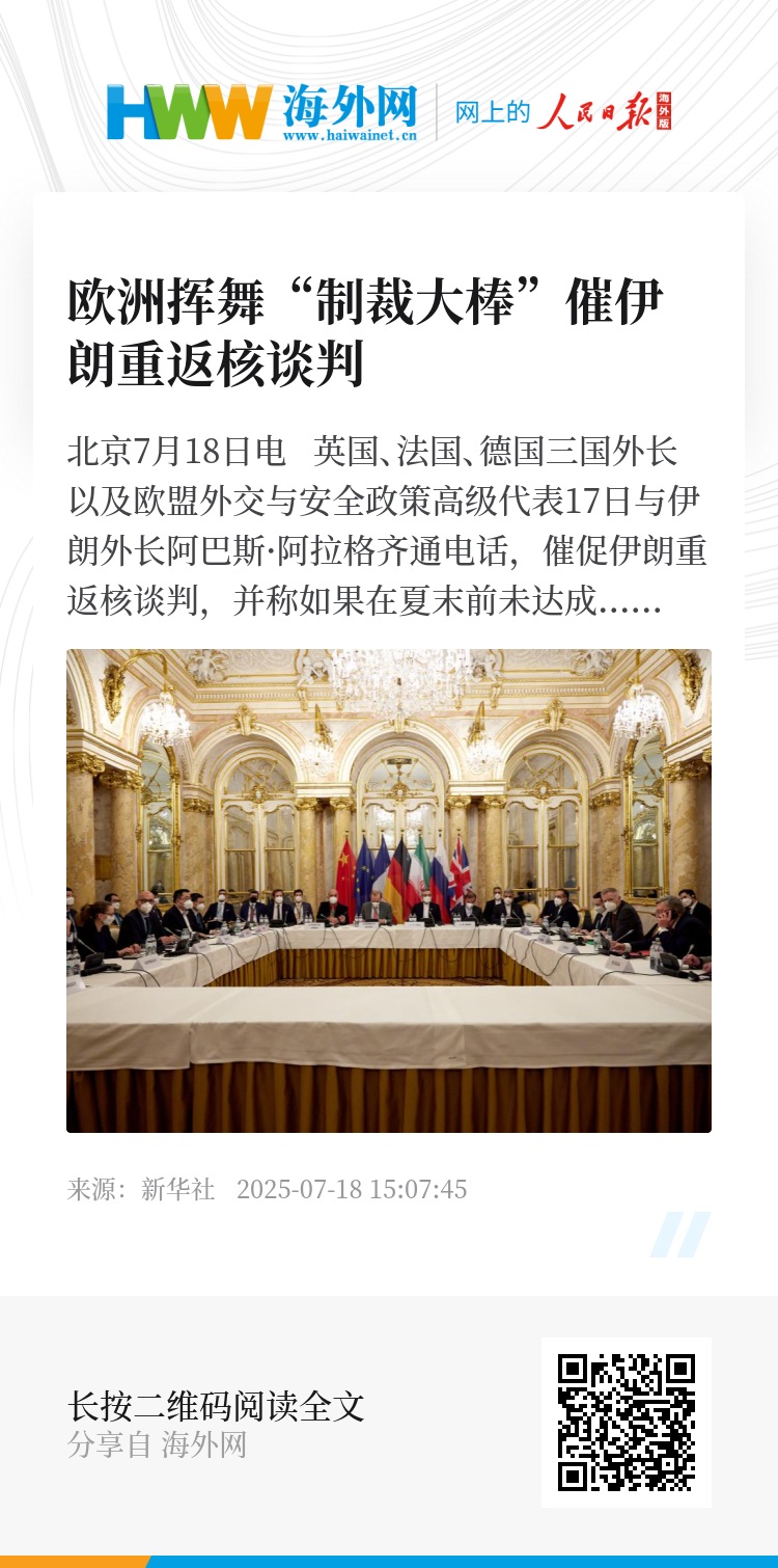 新华社北京7月18日电 英国、法国、德国三国外长以及欧盟外交与安全政策高级代表17日与伊朗外长阿巴斯·阿拉格齐通电话,催促伊朗重返核谈判,并称如果在夏末前未达成“切实进展”,将恢复所有对伊制裁。