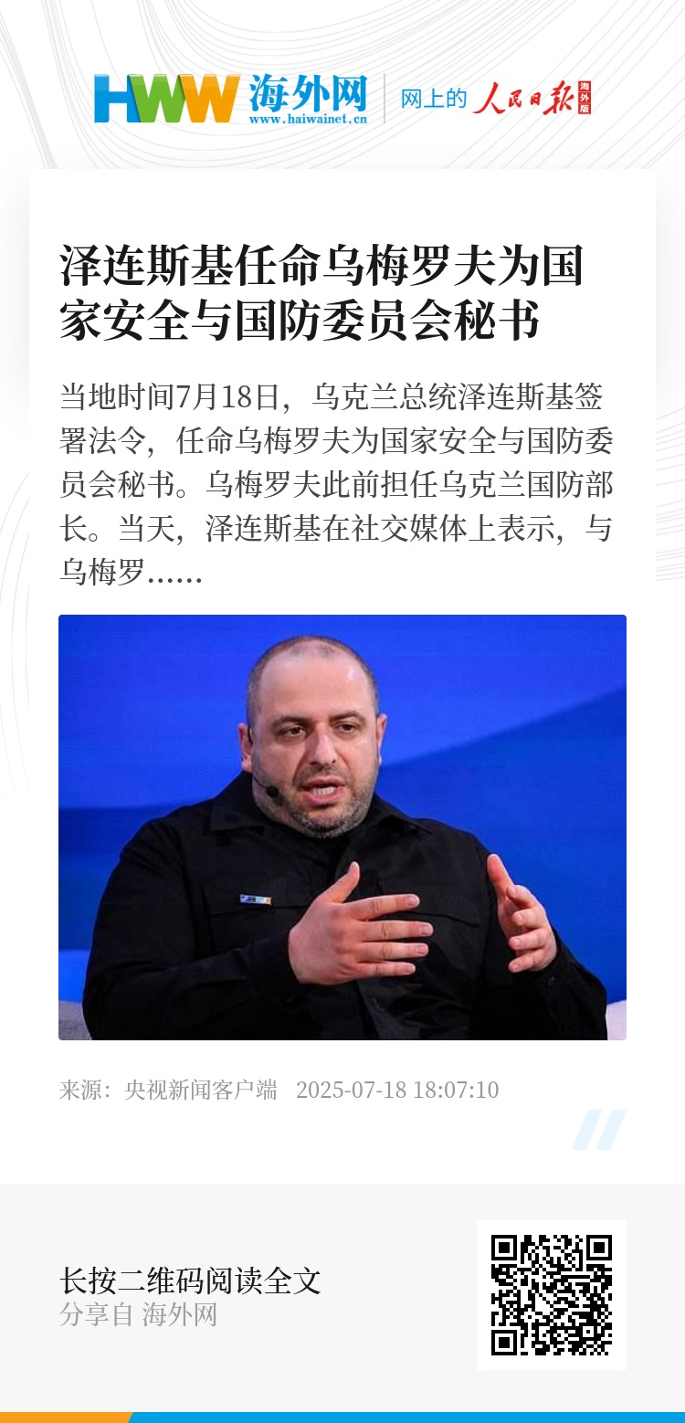 当地时间7月18日,乌克兰总统泽连斯基签署法令,任命乌梅罗夫为国家安全与国防委员会秘书。乌梅罗夫此前担任乌克兰国防部长。