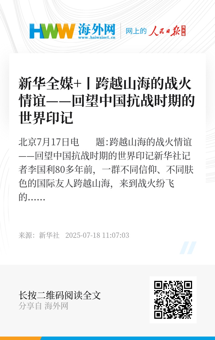 新华社北京7月17日电 题:跨越山海的战火情谊——回望中国抗战时期的世界印记