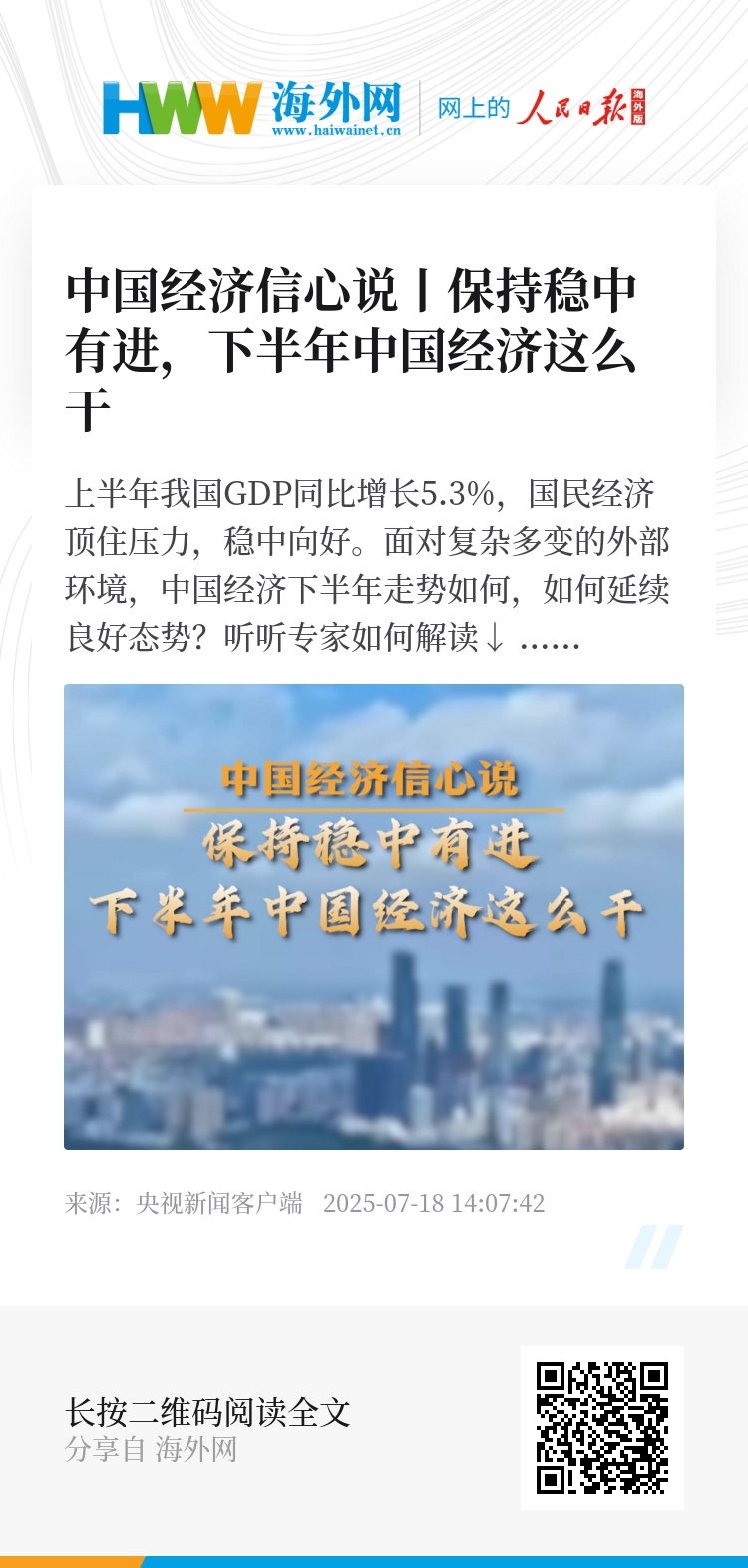 上半年我国GDP同比增长5.3%,国民经济顶住压力,稳中向好。面对复杂多变的外部环境,中国经济下半年走势如何,如何延续良好态势?听听专家如何解读↓