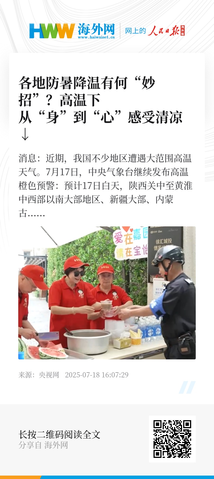 这几天,山西持续出现高温天气,多地最高气温超过35℃。在太原市,城管部门积极洒水降温,调整人工户外作业时间。在运城,当地城市驿站24小时免费向市民开放,户外劳动者随时可以到驿站补充水分、避暑休息。