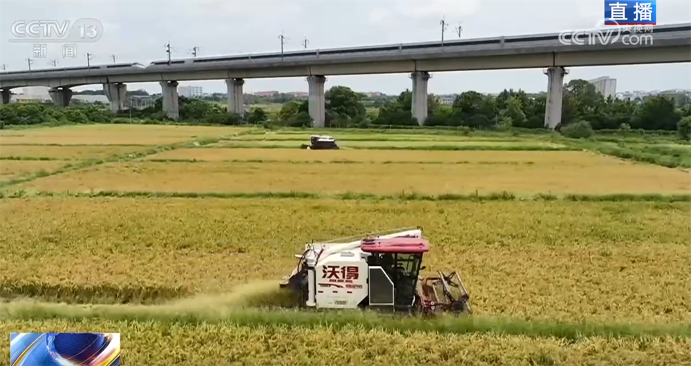 在位于江西宜春高安市石脑镇的一片稻田里,现在正值繁忙的双抢时节,双抢是指“抢收早稻,抢种晚稻”。大家可以看到,稻田里,收割机正穿梭在金黄色的稻浪之中。机械化的收割效率很高,一台每天能够收割五六十亩,像这里的500多亩稻田几台收割机一天就能完成。同时,农机手的工作环境也得到了很大改善,驾驶室都安装了空调,不用风吹日晒。