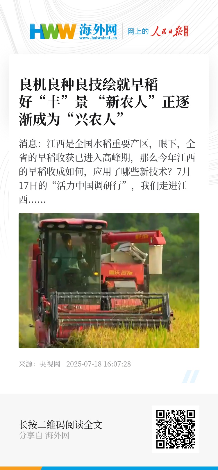 央视网消息:江西是全国水稻重要产区,眼下,全省的早稻收获已进入高峰期,那么今年江西的早稻收成如何,应用了哪些新技术?7月17日的“活力中国调研行”,我们走进江西宜春高安市。