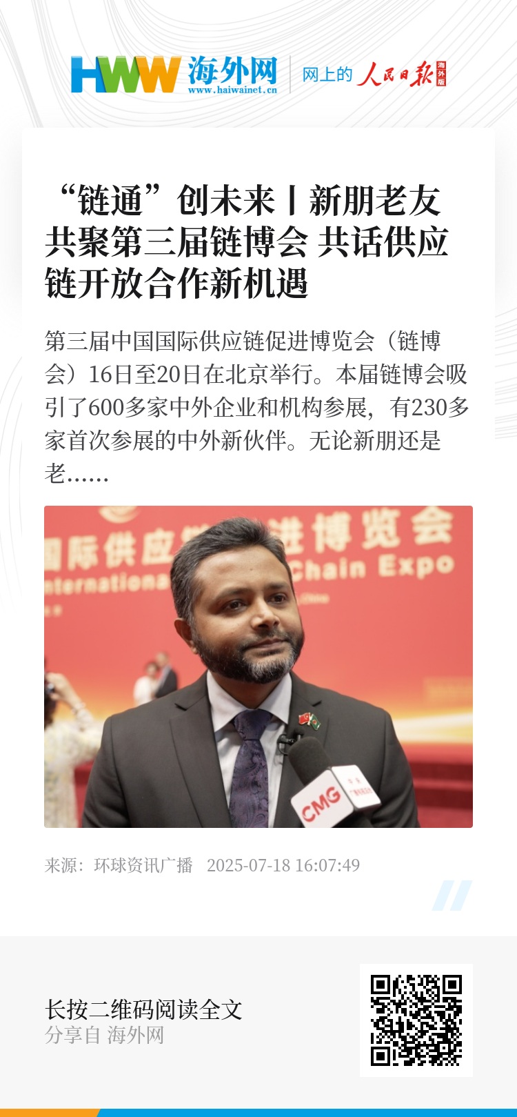 第三届中国国际供应链促进博览会(链博会)16日至20日在北京举行。本届链博会吸引了600多家中外企业和机构参展,有230多家首次参展的中外新伙伴。无论新朋还是老友,多位受访外国参会人士表示,期待从代表着全球供应链开放与合作的链博会上挖掘新机遇。