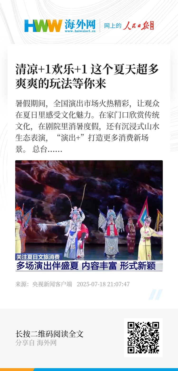 暑假期间,全国演出市场火热精彩,让观众在夏日里感受文化魅力。在家门口欣赏传统文化,在剧院里消暑度假,还有沉浸式山水生态表演,“演出+”打造更多消费新场景。