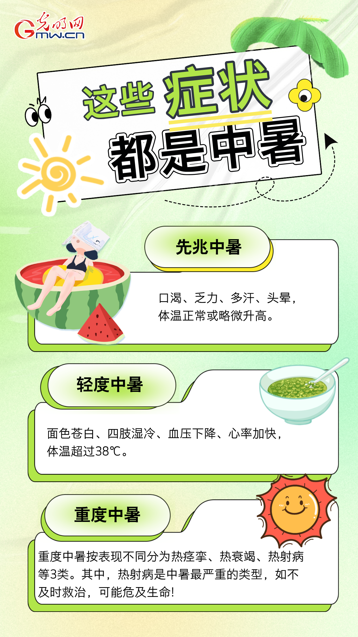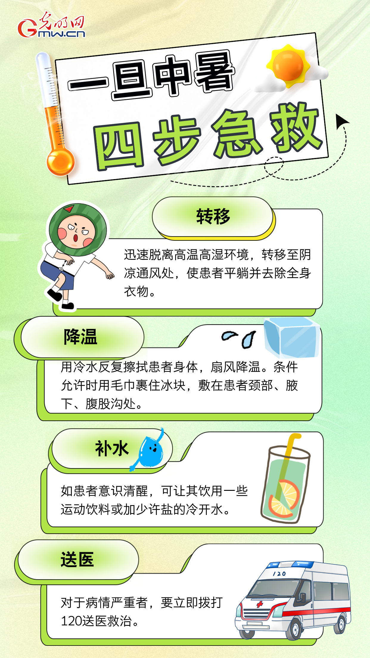 躲烈日,享清凉;勤补水,是王道。人群中央多关照,中暑症状早知晓,及时送医不可少,健康才是最紧要。别让高温灼伤你的健康!