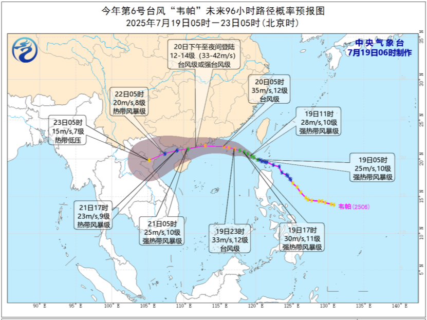 7月19日8时至20日8时,受“韦帕”和西南季风的共同影响,南海大部、巴士海峡、台湾海峡、台湾以东洋面、东海南部、广东东部沿海、福建沿海、台湾岛将有6~7级风,阵风8~9级,南海东北部海域、巴士海峡、台湾海峡北部海域风力可达8~10级,阵风11~12级,台风中心经过的附近海域风力有10~12级,阵风13~14级。