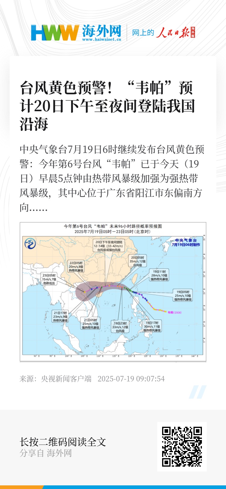 预计,“韦帕”将以每小时15~20公里的速度向西偏北方向移动,即将移入南海东北部海面,强度逐渐加强,逐渐向广东深圳到海南文昌一带沿海靠近,将于20日下午至夜间在上述沿海登陆(12~14级,33~42米/秒,台风级或强台风级)。