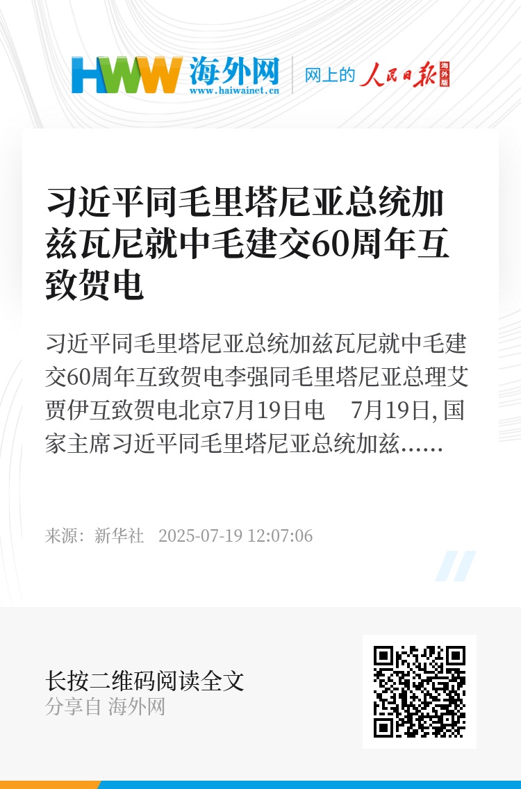 新华社北京7月19日电 7月19日,国家主席习近平同毛里塔尼亚总统加兹瓦尼互致贺电,庆祝两国建交60周年。