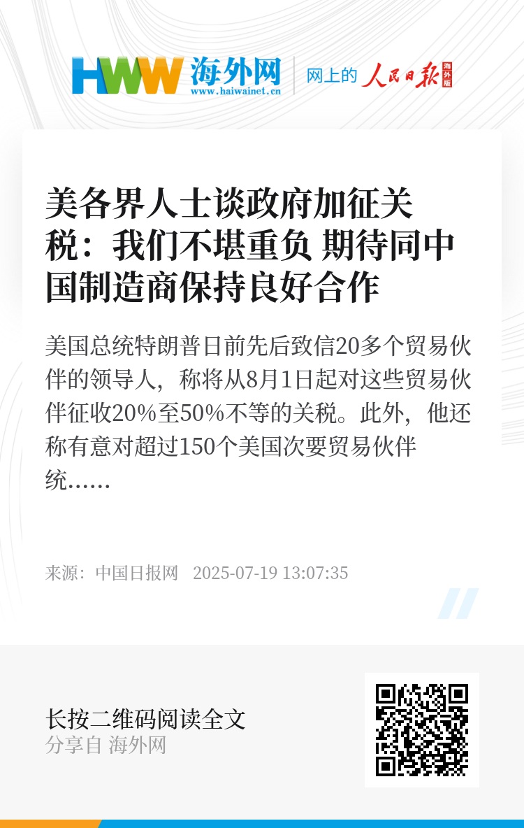 美国总统特朗普日前先后致信20多个贸易伙伴的领导人,称将从8月1日起对这些贸易伙伴征收20%至50%不等的关税。此外,他还称有意对超过150个美国次要贸易伙伴统一加征关税。美国各界人士对《中国日报》表示,加征关税已经导致各行各业不堪重负,期待同中国制造商保持良好合作关系。