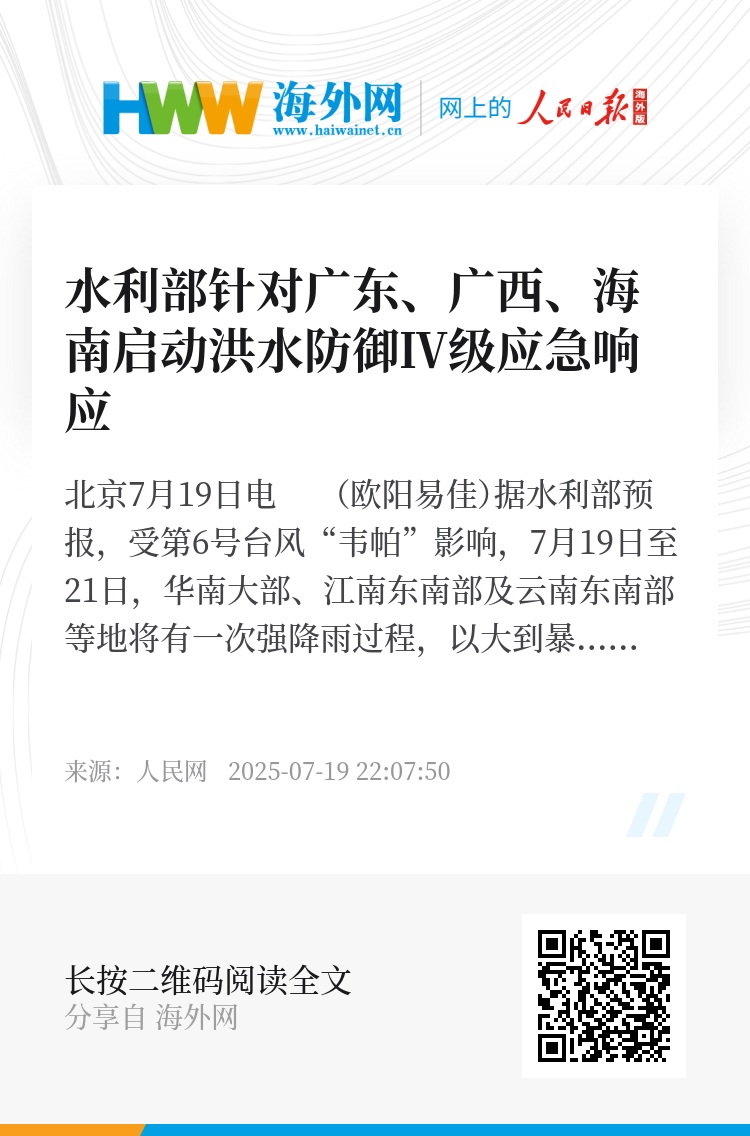 人民网北京7月19日电 (欧阳易佳)据水利部预报,受第6号台风“韦帕”影响,7月19日至21日,华南大部、江南东南部及云南东南部等地将有一次强降雨过程,以大到暴雨为主,其中广东西部沿海、广西南部、海南北部等地部分地区将有暴雨到大暴雨;珠江流域西江、北江、东江、韩江及海南南渡江、万泉河、昌化江将发生明显涨水过程,其中暴雨区内广东漠阳江、鉴江及支流袂花江,广西沿海大风江、福成江,海南文教河等中小河流可能发生超警洪水。7月19日10时,水利部针对广东、广西、海南3省(自治区)启动洪水防御Ⅳ级应急响应,要求地方水利部门和流域管理机构紧盯台风发展态势和移动路径,密切监视流域雨水情变化,加密滚动会商研判,及时发布预警信息,系统、科学、安全、精准调度防洪工程体系,强化堤防巡查防守,切实落实水库及在建工程安全度汛措施,病险水库原则上一律空库运行,做好中小河流洪水、山洪灾害、城市内涝防御等工作,确保人民群众生命财产安全。