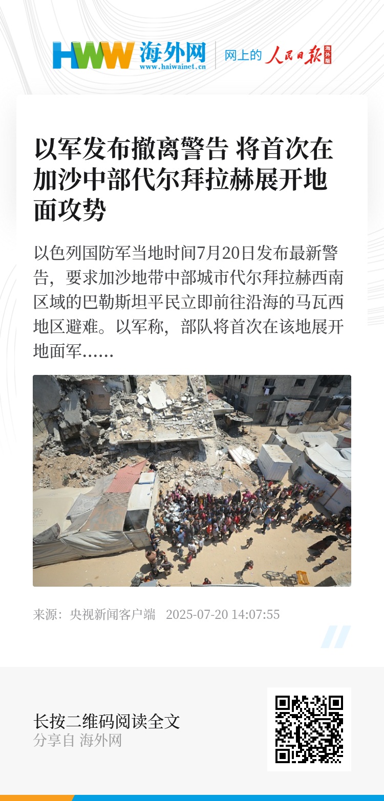 以色列国防军当地时间7月20日发布最新警告,要求加沙地带中部城市代尔拜拉赫西南区域的巴勒斯坦平民立即前往沿海的马瓦西地区避难。以军称,部队将首次在该地展开地面军事行动,标志着战事进一步扩大。