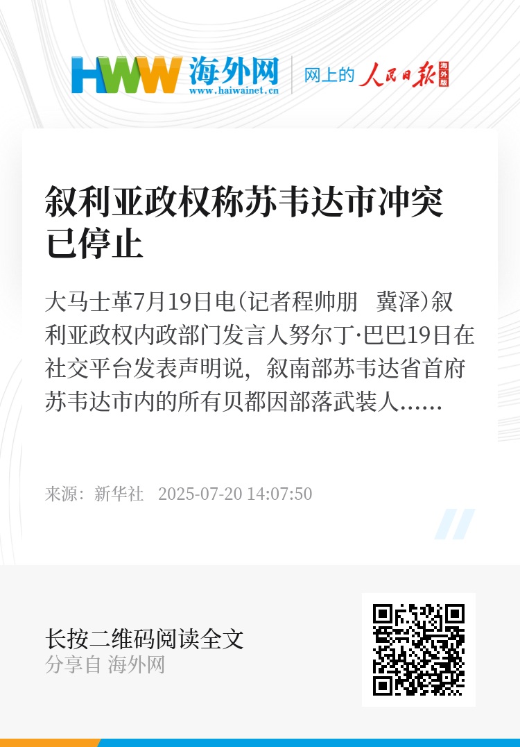 13日以来,苏韦达省德鲁兹武装派别与贝都因部落爆发激烈冲突,叙政权和以色列相继介入。叙利亚政权19日宣布实施全面立即停火,并开始在苏韦达省部署安全部队。