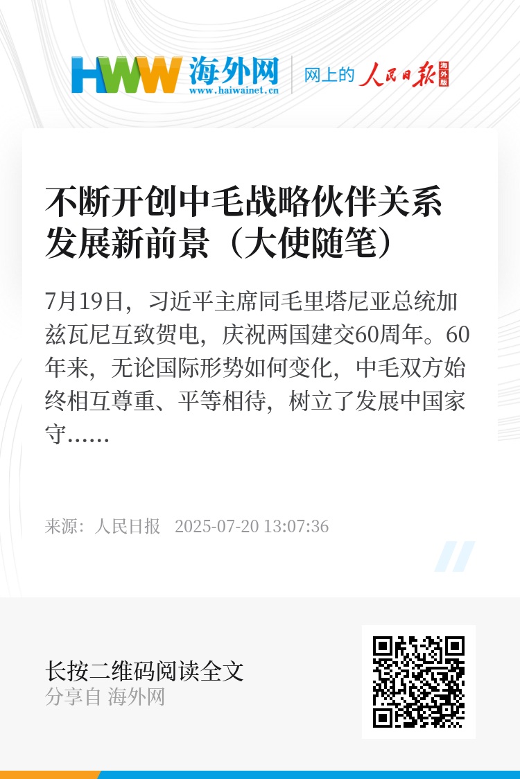 60年风雨同舟,中毛友谊如沙漠中的绿洲般生生不息。展望未来,中方愿同毛方一道,全力落实两国元首重要共识,赓续传统友谊,巩固团结合作,不断开创中毛战略伙伴关系发展新前景。