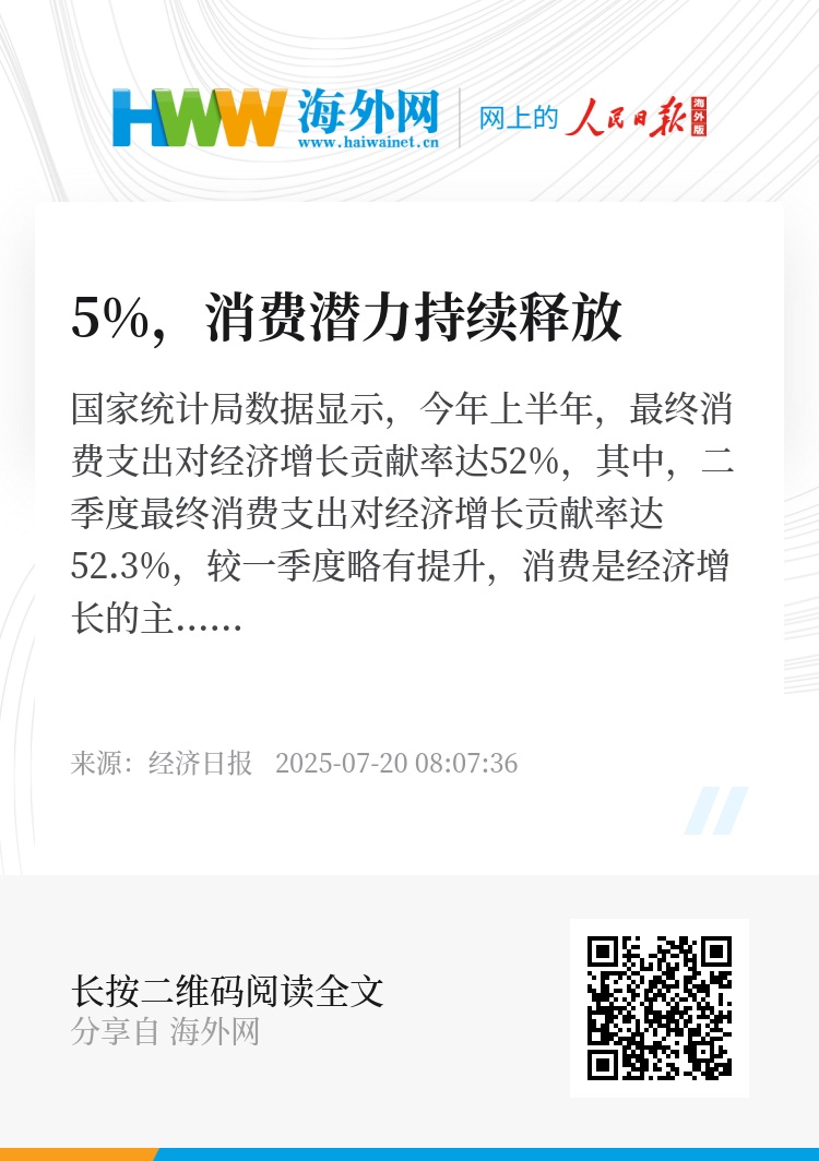 国家统计局数据显示,今年上半年,最终消费支出对经济增长贡献率达52%,其中,二季度最终消费支出对经济增长贡献率达52.3%,较一季度略有提升,消费是经济增长的主动力。多位专家在接受经济日报记者采访时表示,随着各项提振消费政策发力显效,上半年我国消费市场持续回升向好,最终消费牵引国内需求稳步扩大,也彰显出我国庞大市场的韧性和潜力。