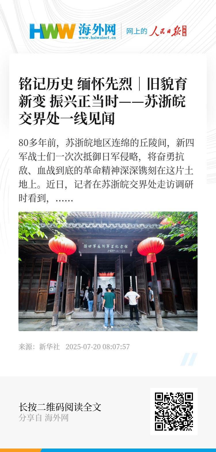 80多年前,苏浙皖地区连绵的丘陵间,新四军战士们一次次抵御日军侵略,将奋勇抗敌、血战到底的革命精神深深镌刻在这片土地上。近日,记者在苏浙皖交界处走访调研时看到,如今的革命老区,既回响着新四军壮烈的历史长歌,也在新时代孕育着高质量发展的澎湃动能。在历史与现实的交汇处,续写砥砺前行、向新发展的动人故事。