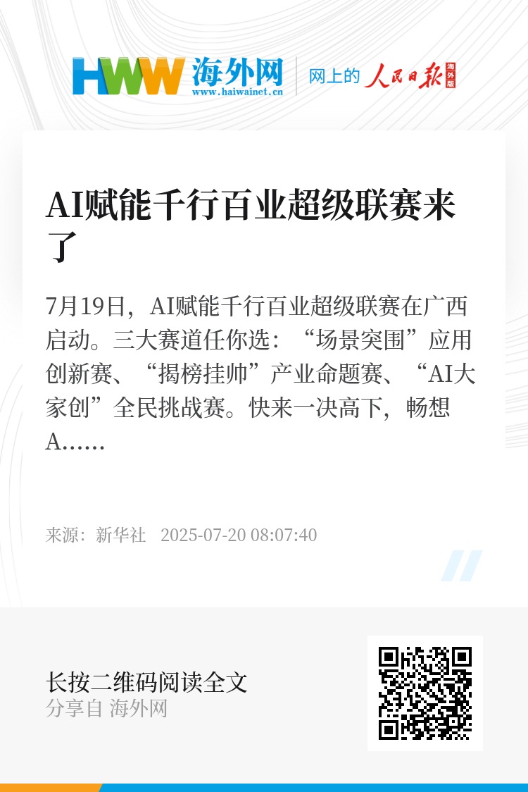 7月19日,AI赋能千行百业超级联赛在广西启动。三大赛道任你选:“场景突围”应用创新赛、“揭榜挂帅”产业命题赛、“AI大家创”全民挑战赛。快来一决高下,畅想AI未来!(本视频采用AI技术辅助制作)