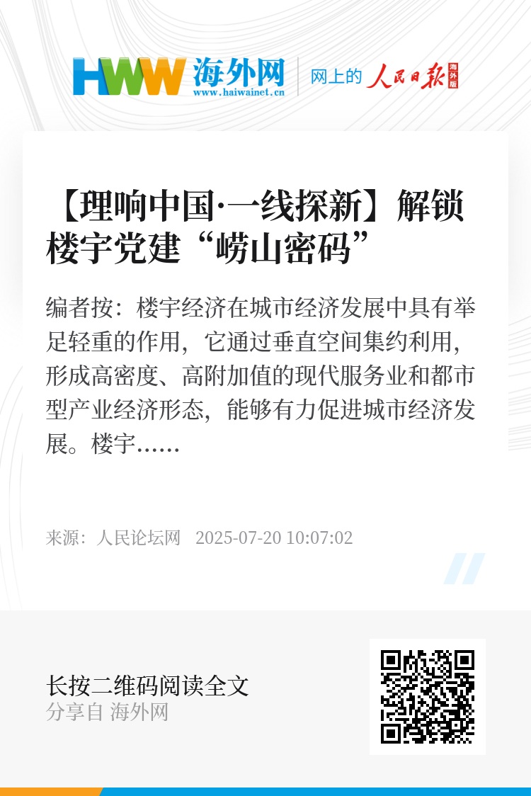 从组织空转到堡垒坚固、从治理失焦到精准高效、从情感疏离到温暖和谐、从资源割裂到融合共享……崂山区坚持党建引领,在楼宇这个“最小单元”深耕细作,形成破解楼宇治理难题的成功探索。期待各地未来能打造更多“党建强、治理优、经济活、情感浓”的楼宇发展新生态,为城市治理体系和治理能力现代化提供更多优质经验。