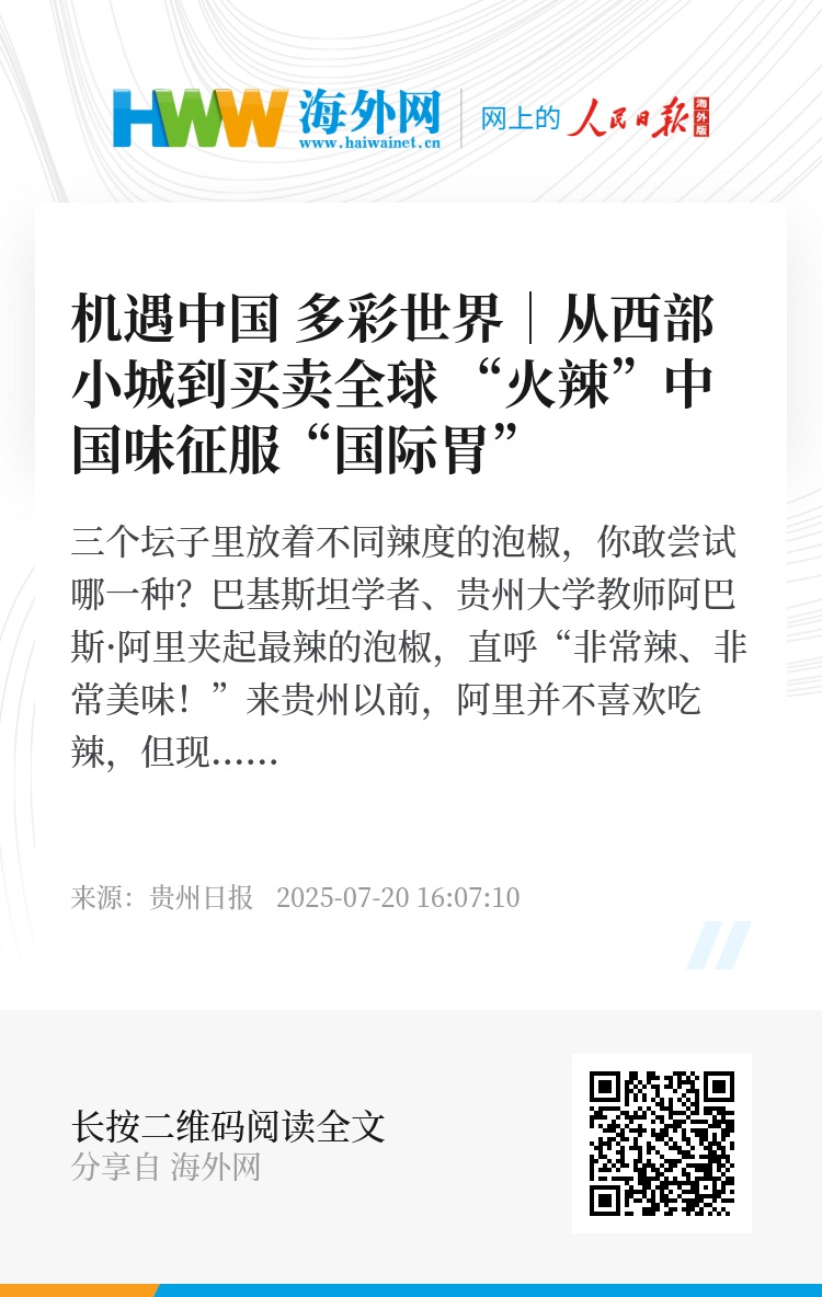 从西部小城到世界餐桌,世界各国味蕾正被这片土地的热情点燃。巴基斯坦学者无辣不欢的蜕变,印尼青年体验舂辣椒时的新奇,黔北的火红产业以科技创新、全链整合和开放姿态将辣椒做成了连接世界的语言。当不同肤色的手共同揭开辣坛的封泥,尝出的不仅是层次分明的辣度,更是以辣为媒、让世界品味产业创新的生动实践。