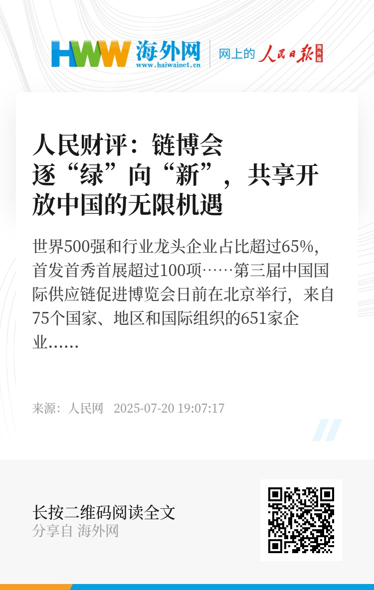 世界500强和行业龙头企业占比超过65%,首发首秀首展超过100项……第三届中国国际供应链促进博览会日前在北京举行,来自75个国家、地区和国际组织的651家企业和机构参展,集中展示各链条上中下游关键环节的新技术、新产品、新服务。透过链博会这个窗口,我们能够看到中国推进合作共赢的诚意,读懂产业链供应链逐“绿”向“新”的发展大势。
