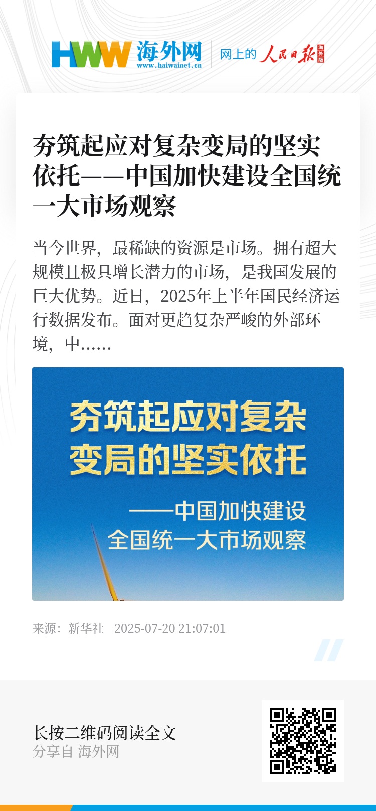 加快建设统一、开放、活跃的中国大市场,必将为中国经济注入持续动力和更大确定性,为世界各国共同发展提供更加广阔的天地。(作者 新华社记者)