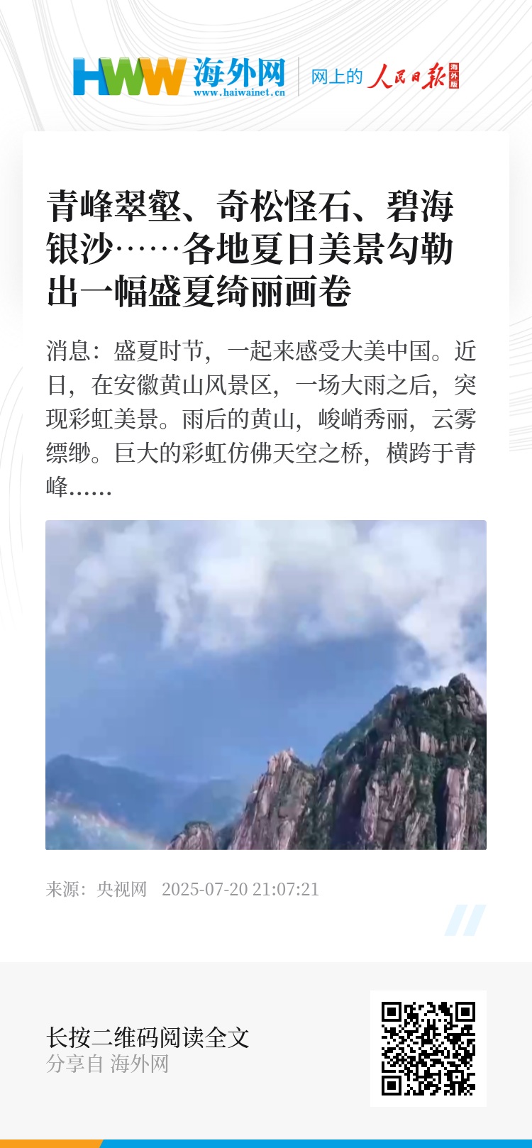 央视网消息:盛夏时节,一起来感受大美中国。近日,在安徽黄山风景区,一场大雨之后,突现彩虹美景。雨后的黄山,峻峭秀丽,云雾缥缈。巨大的彩虹仿佛天空之桥,横跨于青峰翠壑之上,与山间奇松怪石相互映衬,勾勒出一幅绮丽的夏日画卷。