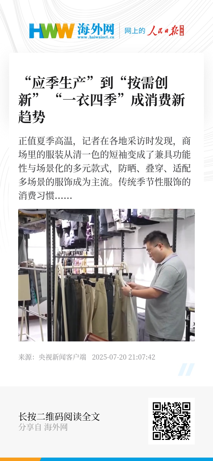 正值夏季高温,记者在各地采访时发现,商场里的服装从清一色的短袖变成了兼具功能性与场景化的多元款式,防晒、叠穿、适配多场景的服饰成为主流。传统季节性服饰的消费习惯正在被打破,“一衣四季”的消费新趋势正在形成。