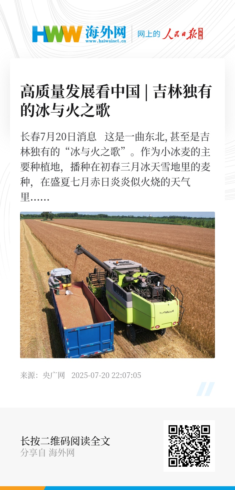 在洮南,在镇赉,吉林独有的收割季里,麦场上,新收的小冰麦正陆续运往仓储点,等待进入加工环节,终将化为优质面粉端上餐桌。这场丰收,是对耕耘的肯定,更是镇赉、洮南等地以新质生产力激活农业潜力、推动现代农业高质量发展的生动缩影。(作者 张学龙 王凯)