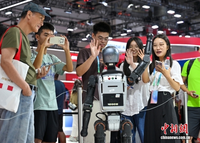 资料图:7月19日,北京,参观者与展出的人形机器人挥手互动。当日,第三届中国国际供应链促进博览会迎来公众开放日。中新社记者 赵文宇 摄