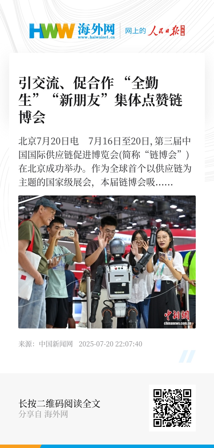 中新网北京7月20日电 7月16日至20日,第三届中国国际供应链促进博览会(简称“链博会”)在北京成功举办。