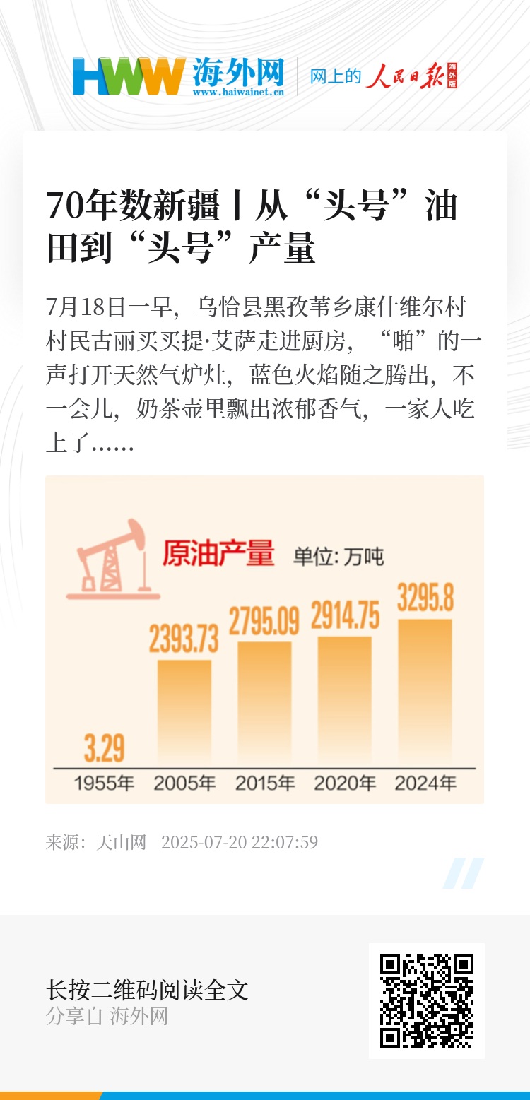 从克拉玛依油田诞生起,70年来,石油工业在新疆经济结构中始终举足轻重,持续为各项事业作出贡献,在人们看不到的地方,它化作一条条道路、一座座桥梁、一幢幢高楼、一所所学校……让新疆各族人民在追求美好生活的道路上昂首阔步。(记者 于江艳)
