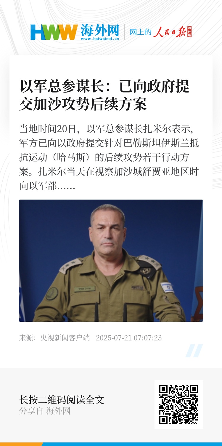 当地时间20日,以军总参谋长扎米尔表示,军方已向以政府提交针对巴勒斯坦伊斯兰抵抗运动(哈马斯)的后续攻势若干行动方案。