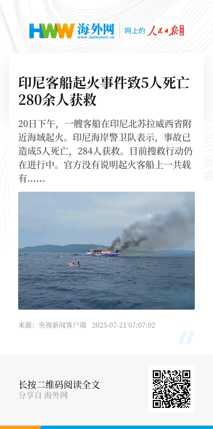 20日下午,一艘客船在印尼北苏拉威西省附近海域起火。印尼海岸警卫队表示,事故已造成5人死亡,284人获救。目前搜救行动仍在进行中。