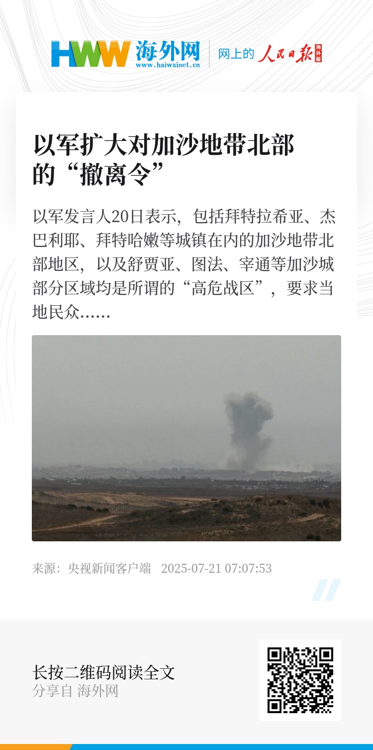 以军发言人20日表示,包括拜特拉希亚、杰巴利耶、拜特哈嫩等城镇在内的加沙地带北部地区,以及舒贾亚、图法、宰通等加沙城部分区域均是所谓的“高危战区”,要求当地民众立即撤离。
