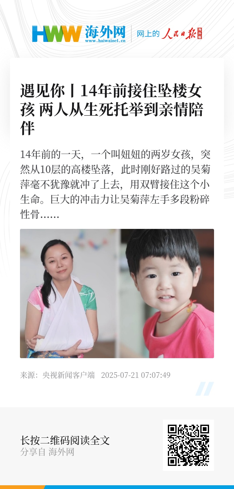 14年前的一天,一个叫妞妞的两岁女孩,突然从10层的高楼坠落,此时刚好路过的吴菊萍毫不犹豫就冲了上去,用双臂接住这个小生命。巨大的冲击力让吴菊萍左手多段粉碎性骨折,但坠楼的女孩妞妞得以生还。
