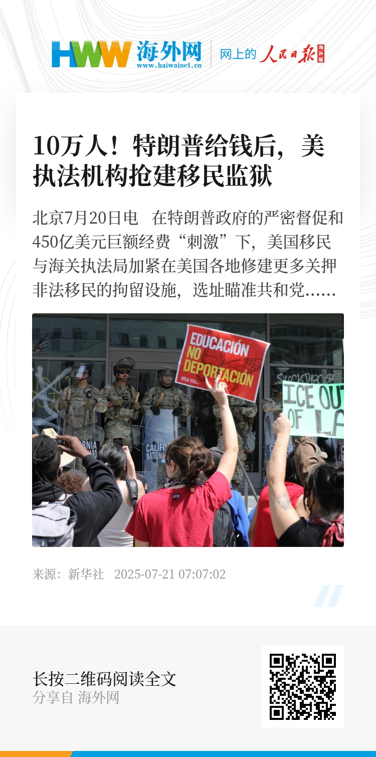 新华社北京7月20日电 在特朗普政府的严密督促和450亿美元巨额经费“刺激”下,美国移民与海关执法局加紧在美国各地修建更多关押非法移民的拘留设施,选址瞄准共和党执政州,计划在今年年底之前修建更多类似不久前落成的“鳄鱼恶魔岛”移民收押中心,将收押容量从4万人扩充至10万人。