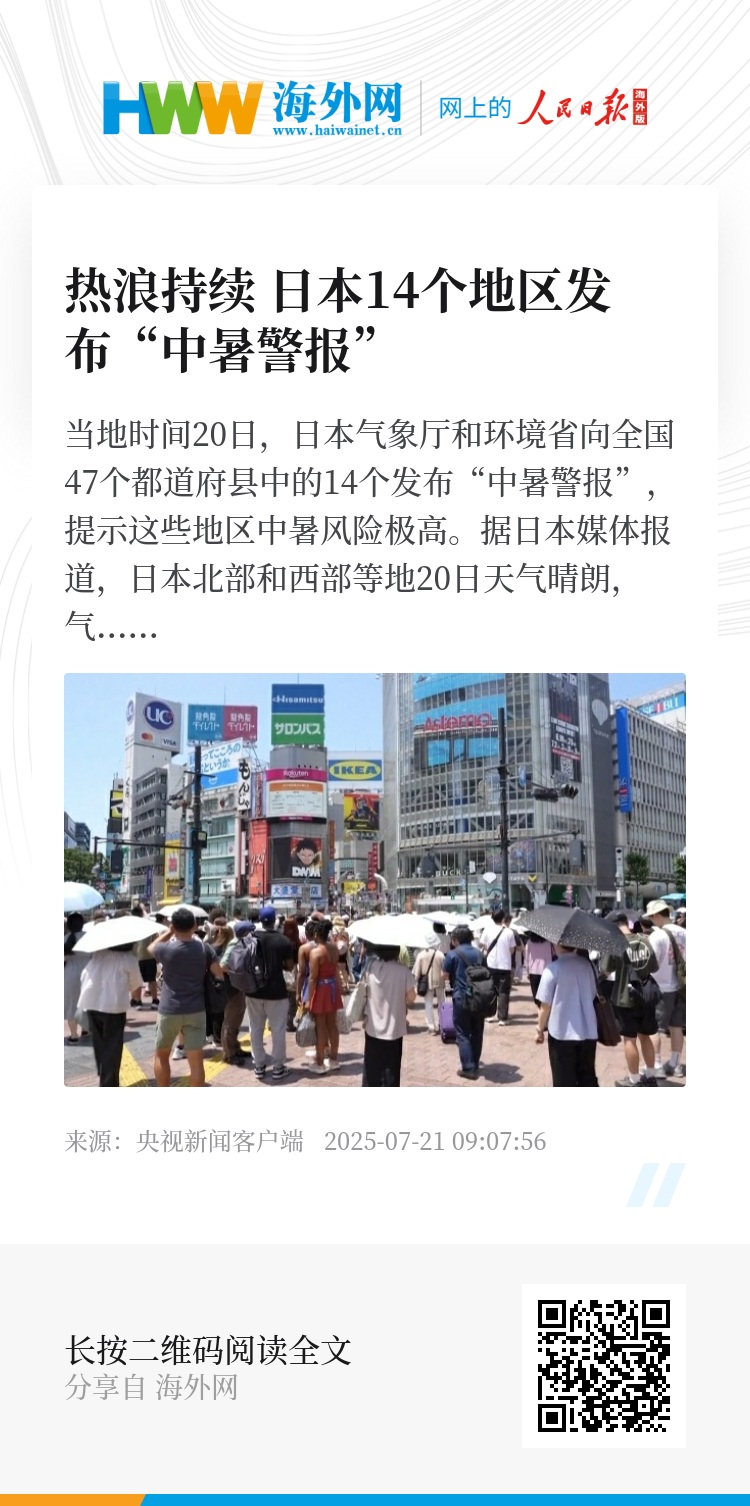 当地时间20日,日本气象厅和环境省向全国47个都道府县中的14个发布“中暑警报”,提示这些地区中暑风险极高。