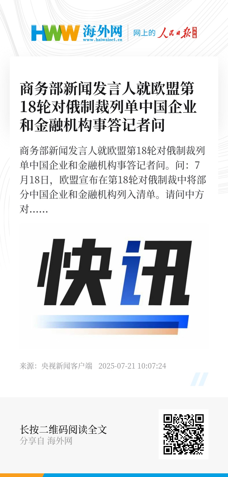 商务部新闻发言人就欧盟第18轮对俄制裁列单中国企业和金融机构事答记者问。