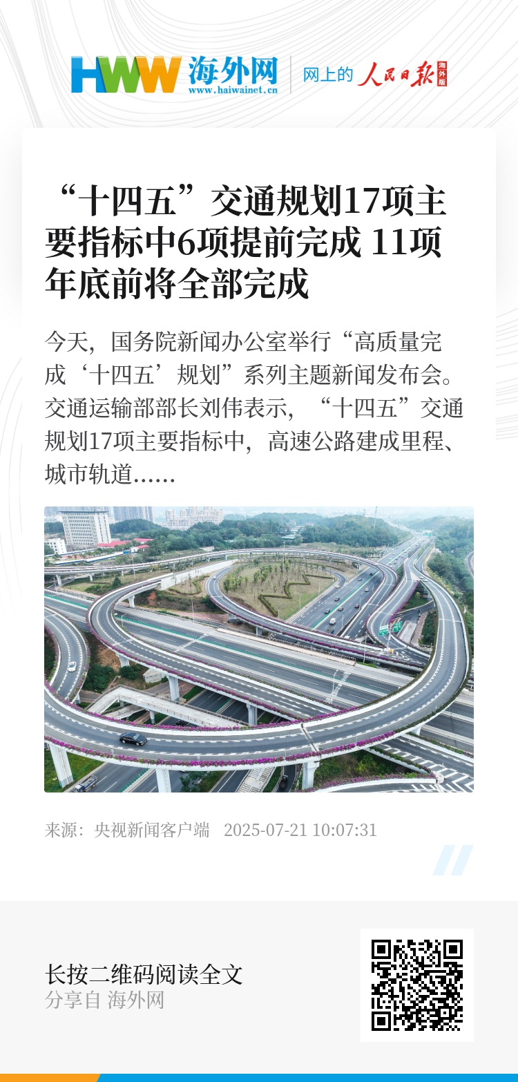 交通运输部部长刘伟表示,“十四五”交通规划17项主要指标中,高速公路建成里程、城市轨道交通运营里程、沿海港口重要港区铁路进港率、建制村快递服务通达率、重点领域北斗系统应用率、城市新能源公交车辆占比6项指标在2024年已提前完成,高速铁路营业里程、枢纽机场轨道交通接入率等11项指标年底前将全部完成。