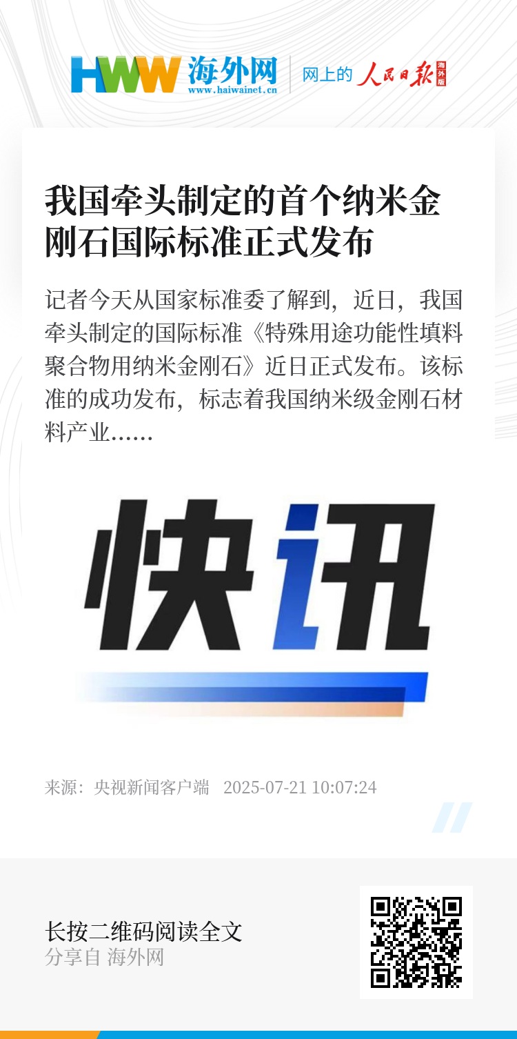 记者今天从国家标准委了解到,近日,我国牵头制定的国际标准《特殊用途功能性填料 聚合物用纳米金刚石》近日正式发布。该标准的成功发布,标志着我国纳米级金刚石材料产业实现了从“深耕积淀”到“引领国际”的历史性跨越。