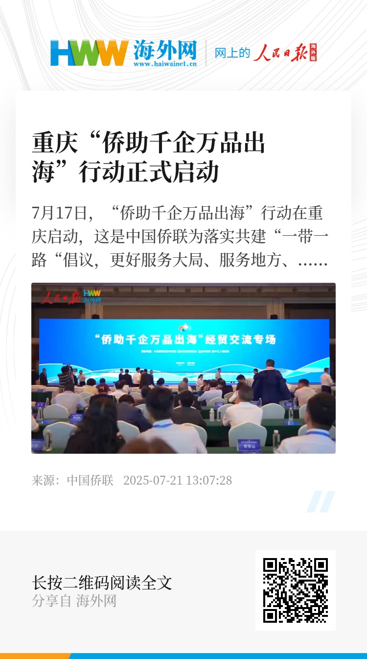 7月17日,“侨助千企万品出海”行动在重庆启动,这是中国侨联为落实共建“一带一路“倡议,更好服务大局、服务地方、服务侨胞而实施的专项行动。行动整合海内外侨界渠道和力量,打造侨界服务企业出海、推动“一带一路”经贸交流合作的平台与体系,重点支持国内企业和优质产品走向全球。