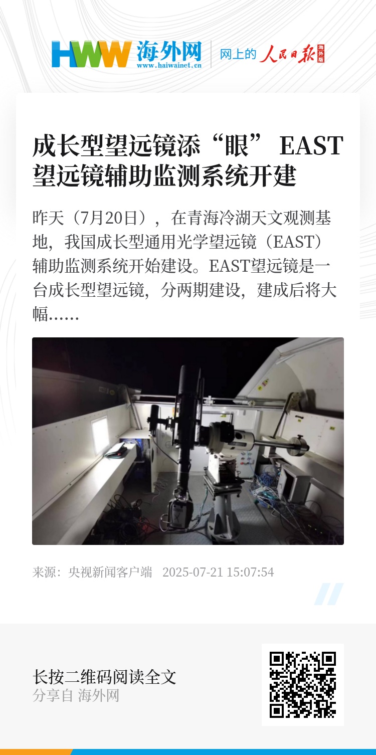 昨天(7月20日),在青海冷湖天文观测基地,我国成长型通用光学望远镜(EAST)辅助监测系统开始建设。
